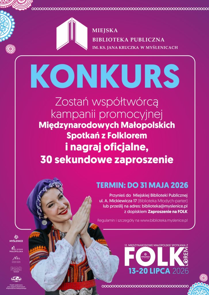 Więcej na stronach Miejskiej Biblioteki Publicznej im. ks. Jana Kruczka w Myślenicach: https://biblioteka.myslenice.pl/konkursy/zaproszenie-na-folk-wez-udzial-w-konkursie/